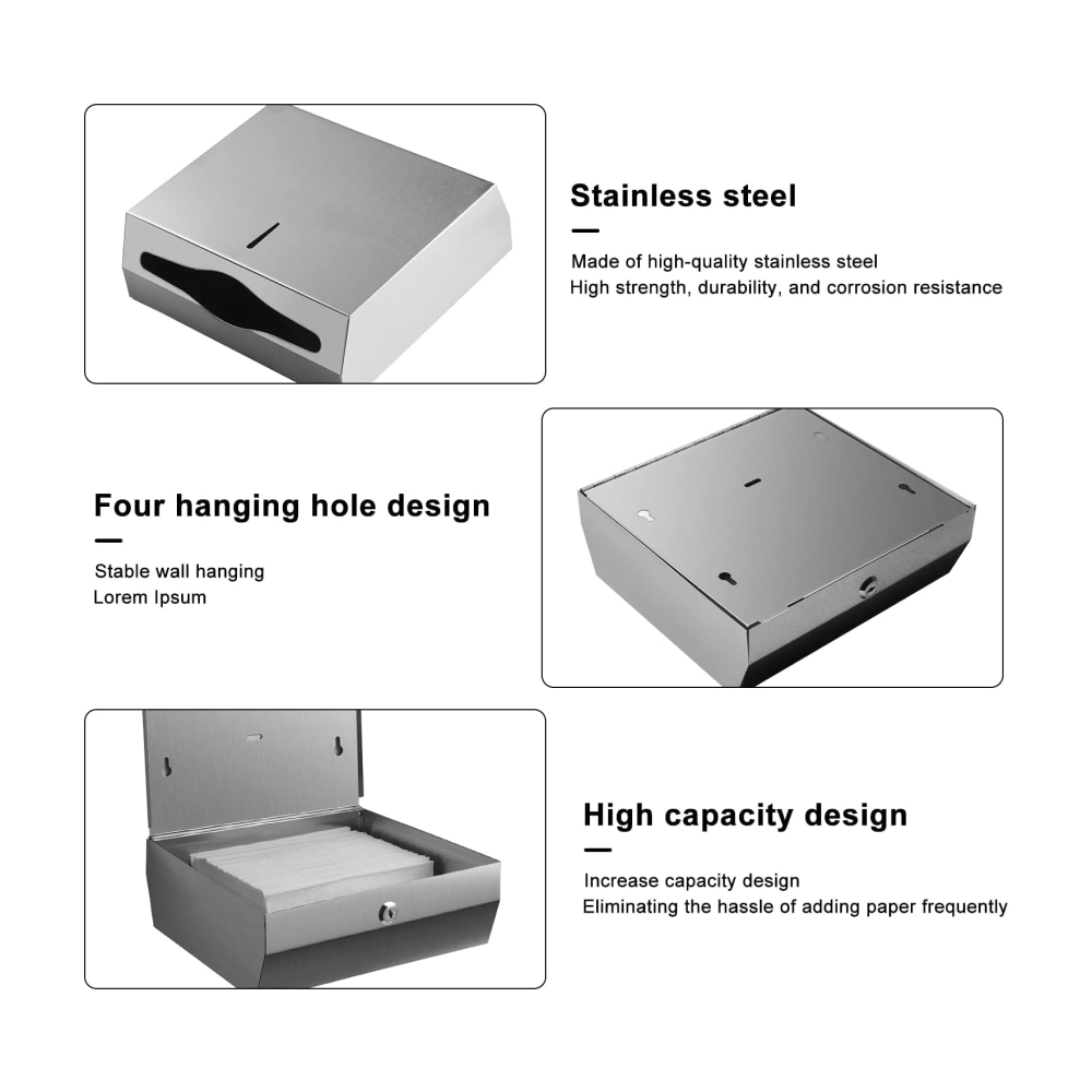 -Designed for easy installation and daily convenience, the dispenser is widely used in public restrooms, offices, restaurants, hotels, and family bathrooms. With strong load-bearing strength and a sleek stainless finish, it provides both practicality and elegance to any setting.